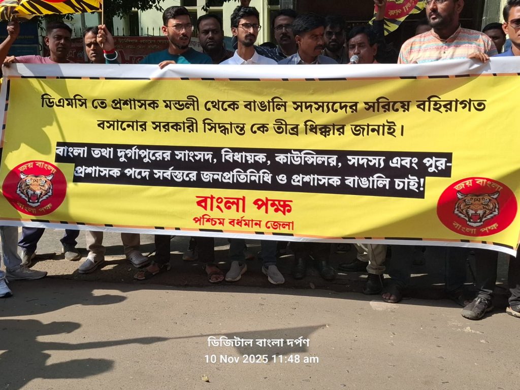 সোমবার সকালে দুর্গাপুর মিউনিসিপাল কর্পোরেশন এর প্রবেশদ্বারে প্রশাসনে বাঙ্গালীদের অংশগ্রহণ নিশ্চিত করার দাবিতে বিক্ষোভ সমাবেশ আয়োজন করে বাংলা পক্ষ। পশ্চিম বর্ধমান জেলার পক্ষ থেকে সংগঠনের সদস্য জানান প্রশাসনিক স্তরে বাঙালির প্রতিনিধিত্ব ক্রমশ হ্রাস পাচ্ছে – যা তারা “অন্যায় ও বৈষম্যমূলক” বলে দাবি করেন। বাংলা পক্ষের পশ্চিম বর্ধমান জেলা সম্পাদক অক্ষয় বন্দ্যোপাধ্যায় বলেন, “দুর্গাপুরের প্রশাসন বাংলার মাটির মানুষের হাতে থাকা উচিত। আমরা প্রশাসনে বাঙালি নিয়োগ ছাড়া থামবো না।”