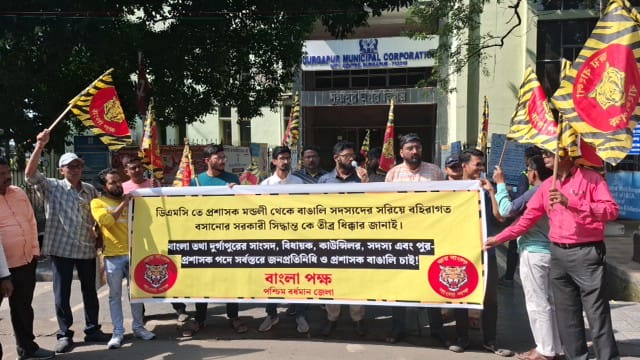 সোমবার সকালে দুর্গাপুর মিউনিসিপাল কর্পোরেশন এর প্রবেশদ্বারে প্রশাসনে বাঙ্গালীদের অংশগ্রহণ নিশ্চিত করার দাবিতে বিক্ষোভ সমাবেশ আয়োজন করে বাংলা পক্ষ। পশ্চিম বর্ধমান জেলার পক্ষ থেকে সংগঠনের সদস্য জানান প্রশাসনিক স্তরে বাঙালির প্রতিনিধিত্ব ক্রমশ হ্রাস পাচ্ছে – যা তারা “অন্যায় ও বৈষম্যমূলক” বলে দাবি করেন। বাংলা পক্ষের পশ্চিম বর্ধমান জেলা সম্পাদক অক্ষয় বন্দ্যোপাধ্যায় বলেন, “দুর্গাপুরের প্রশাসন বাংলার মাটির মানুষের হাতে থাকা উচিত। আমরা প্রশাসনে বাঙালি নিয়োগ ছাড়া থামবো না।”