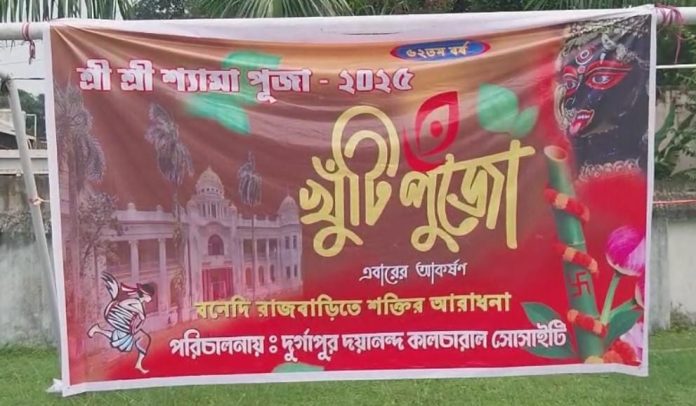 মহালয়ার পুণ্য তিথিতে দুর্গাপুরের প্রাচীনতম ঐতিহ্যবাহী কালীপুজো গুলির মধ্যে অন্যতম দুর্গাপুর দয়ানন্দ কালচারাল সোসাইটি তাদের ৬২ তম বর্ষের খুঁটিপুজো সম্পন্ন করলো। এদিন সকাল থেকেই পুজো মুখর পরিবেশে ক্লাব প্রাঙ্গণ ভরে ওঠে ক্লাব সদস্য ও সদস্যাদের মধ্যে উৎসবের আমেজ স্পষ্টভাবে চোখে পড়ে। সকলে মিলিতভাবে খুঁটিপুজোর মধ্যে দিয়ে এ বছরের প্যান্ডেল তৈরীর সূচনা করেন। এই দীর্ঘ ৬২ বছরের ঐতিহ্য ধরে রেখে এবছর দয়ানন্দ কালচারাল সোসাইটি। তাদের  থিম -“বনেদি রাজবাড়ীতে শক্তির আরাধনা”।