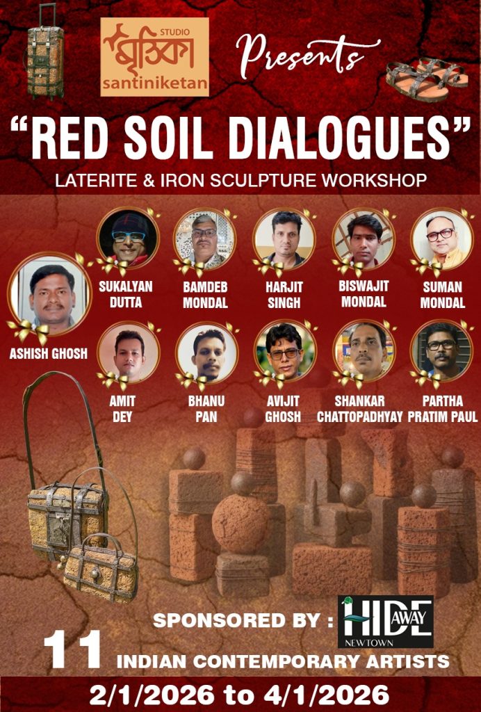 সময় কখনো থেমে থাকে না। তবুও কিছু কিছু জায়গা, কিছু কিছু সম্পর্ক সময়ের স্রোতকে অস্বীকার করে নিঃশব্দে বেঁচে থাকে। বীরভূমের বিদ্যাধরপুরের খঞ্জনপুর এ তেমনি এক সৃষ্টিশীল আশ্রয় – “স্টুডিও মৃত্তিকা।” ২৫ সালে যাত্রা শুরু করা এই শিল্প কেন্দ্রের প্রতিটি ইট, প্রতিটি মৃত্তিকা কনা যেন আজও বহন করে শিল্পী গুরু ও শিষ্যের যৌথ স্মৃতি। রাষ্ট্রপতি পুরস্কার প্রাপ্ত ভাস্কর্য শিল্পী ও অধ্যাপক আশীষ ঘোষের হাতে গড়া স্টুডিও মৃত্তিকার ট্যাগলাইন — “কিছুই নয় আর ফেলনা”- শুধু একটি বাক্য নয়, এক দার্শনিক অবস্থান। সেই দর্শনকেই কেন্দ্র করে ২০২৬ সালের ২ থেকে ৪ জনুয়ারি এখানে অনুষ্ঠিত হলো তিনদিনের বিশেষ কর্মশালা “রেড সয়েল ডায়লগস”। দীর্ঘ কুড়ি বছর পর এই কর্মশালার মাধ্যমে এক অনন্য পুনর্মিলনের সাক্ষী থাকলো স্টুডিও মৃত্তিকা ২০০৫ সালে বর্ধমানের ক্যাড(CAD) ডিজাইন আর্ট কলেজের ভাস্কর্য বিভাগের ছাত্ররা — যারা একসময় অধ্যাপক আশীষ ঘোষের কাছে শিল্পের হাতে করে নিয়েছিলেন — আজ সকলেই নিজ নিজ ক্ষেত্রে সুপ্রতিষ্ঠিত।