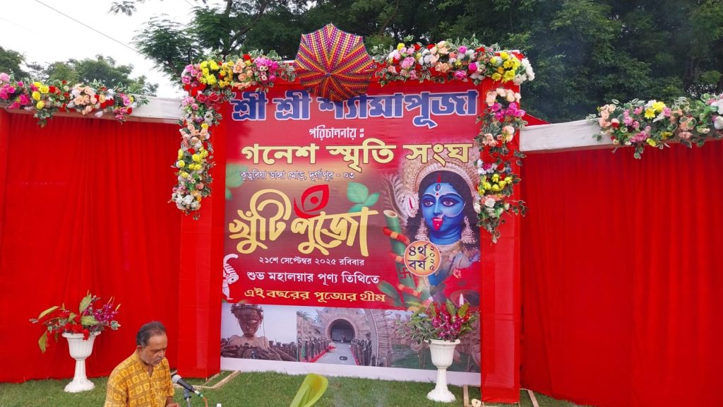 দিকে দিকে আগমনের বার্তা আর সেই শুভ লগ্নে দুর্গাপুরের ১১ নম্বর ওয়ার্ডে কুরুড়িয়া ডাঙ্গার গণেশ স্মৃতি সংঘ তাদের চতুর্থ বর্ষে কালীপুজোর মন্ডপ নির্মাণের সূচনা করতে খুঁটিপূজো সম্পন্ন করল। শনিবার সকাল থেকেই ক্লাব সদস্যদের ঐকান্তিক প্রচেষ্টায় সেজে ওঠে খুঁটি পূজার প্রাঙ্গণ। পুরোহিতের বৈদিক মন্ত্রচ্চারন, ঢাকের বাদ্যি আর ঘন্টার ধ্বনিতে অনুষ্ঠিত হয় এই শুভ অনুষ্ঠান। কালীপুজোর চতুর্থ বর্ষে বিশেষ আকর্ষণ থাকছে থিম – “শ্রম ও সুর”। পূজো কমিটির সম্পাদক নির্মল মাজি জানিয়েছেন, এই অভিনব থিম দর্শকদের কাছে নতুন অভিজ্ঞতা এনে দেবে।