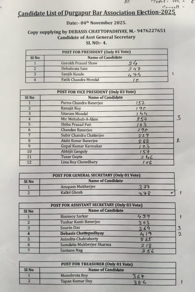 ৪ঠা নভেম্বর দুর্গাপুর মহকুমা আদালতে অনুষ্ঠিত হয় বার অ্যাসোসিয়েশনের নির্বাচন। এবারে নির্বাচনের মুখ্য প্রতিদ্বন্দ্বিতা ছিল প্রাক্তন সভাপতি ও সরকারি পিপি দেবব্রত সাঁই এবং আইনজীবী সঞ্জীব কুন্ডুর মধ্যে। ভোট গণনার পর স্পষ্ট হয়ে যায় হেভি ওয়েট প্রার্থী তথা প্রাক্তন তৃণমূল কাউন্সিলর দেবব্রত সাঁইকে হারিয়ে সভাপতি পদে জয়ী হয়েছেন সঞ্জীব কুন্ডু। সূত্রের খবর দুর্গাপুরে বার অ্যাসোসিয়েশনের ইতিহাসে, এবারই প্রথম কোন প্রার্থী সভাপতি পদে এত বেশি ভোটে পরাজিত হলেন। এই নির্বাচনে সঞ্জীব কুন্ডু প্রাপ্ত ভোট ৪৭৪।